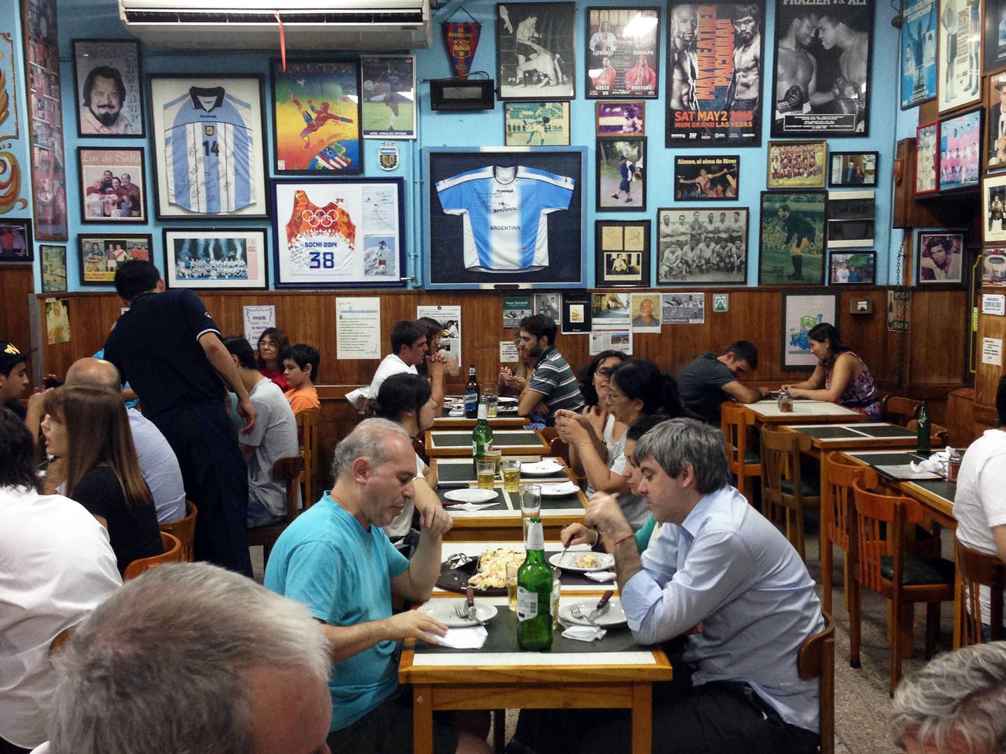 Understanding the local pizza culture is just as important as learning the varieties. First of all, locals never pick up pizza with their hands—in Argentina, pizza is eaten with a fork and a knife. But what is an option is how you position your physical body. Most old school pizzerias have two seating areas—one area for groups to sit down and order entire pies and another self-service standing room only section for the serious pizza fanatics who eat their corte (slice) de parado (standing up).