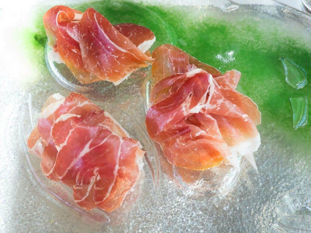 “A podium” of culatello offers three types of culatello for the diner to compare. One option offers an 18-month-old and a 27-month-old traditional version, and a 37-month-aged black pig. The black pig is redder, fattier, richer. But tasting through the plate, the differences become more prominent, both between the ages and from prosciutto, which seems like a pale, plain version in comparison.