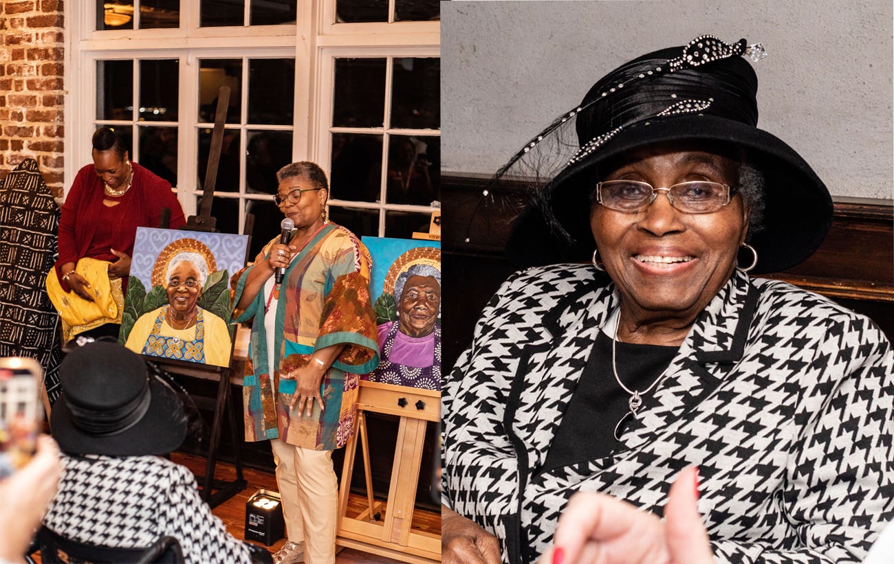 Meanwhile, artist Natalie Daise unveiled her portraits of the mothers being celebrated, including Albertha Grant, founder of Bertha’s Kitchen, chef Sara Green of Gullah Grub on St. Helena Island, and cookbook author Sallie Ann Robinson from Daufuskie Island. Embraced by dark green collard leaves, each woman is depicted wearing a brightly patterned kitchen apron and a halo of woven sweetgrass. Then, Meggett, dressed in a matching black suit and bedazzled hat, was seated at the head of one table. (No one knew that night, but it would be the Edisto matriarch’s last public appearance. Meggett passed away on April 21.) Ganaway’s own grandmother sat beside her. And just before hot platters hit the tablecloth, A$iahMae, Charleston’s poet laureate, recited her new poem “Benefaction.”