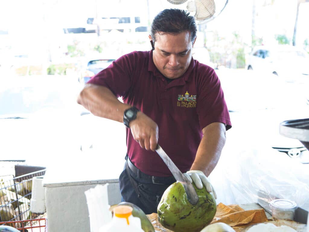 An open-air food market that attracts everyone from Ferran Adrià to Martha Stewart to 22-year-old Midwestern girls like myself, El Palacio de los Jugos translates to "The Palace of Juices" but it's more of a palace of every edible Latin good. Crowds of people squeeze through narrow aisles to get to the various food stands, calling to the cashiers in Spanish and pointing to fatty chicharrones, mounds of pea-flecked arroz amarillo, and stewed ropa vieja. In the middle of the market, a man with a shopping cart full of green coconuts hacks off their tops, seemingly carelessly but always precisely, and inserts a straw into the cavity, passing them off to customers waving dollar bills. It's a spectacle but no one cheers.