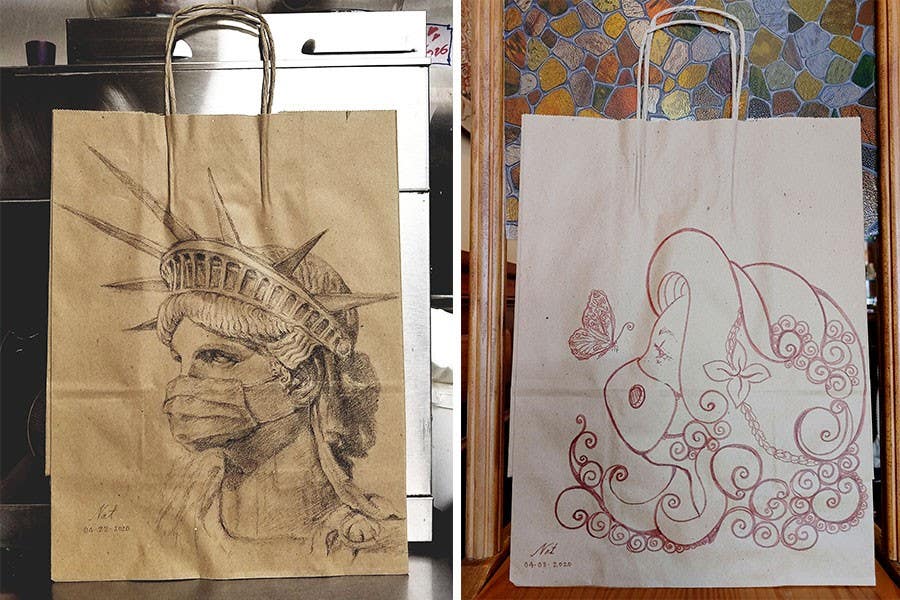 To stay in touch with regulars, he pens customers’ names in cursive script on each plain brown paper bag that goes out the door. Chanthanaluck often adds messages like “stay safe” before bad weather hits or when COVID-19 cases spike. When orders are slow, he has time for more elaborate sketches, like the Statue of Liberty wearing a surgical mask. As a child in rural northern Thailand, Chanthanaluck taught himself calligraphy by studying magazines in his aunt’s seamstress shop and hand-drawn posters outside the local movie theater. (Printed ads were too expensive, he explains, so local artists made the signs for each new film.) When he graduated to secondary school, Chanthanaluck was sent to live in Bangkok with extended family, where he cut vegetables in his uncle’s restaurant. “That’s what Thai kids traditionally do,” he says. “You have to help out with the family business.” After completing a trade degree in art, Chanthanaluck immigrated to Massachusetts where his mother lived, and he eventually opened his own restaurant. Now, his family, including his wife and cousins, help with the cooking. “A lot of customers tried to save us when the lockdown happened,” he says. “They wanted to support us, and I really appreciate them. So this is how I say thank you.”