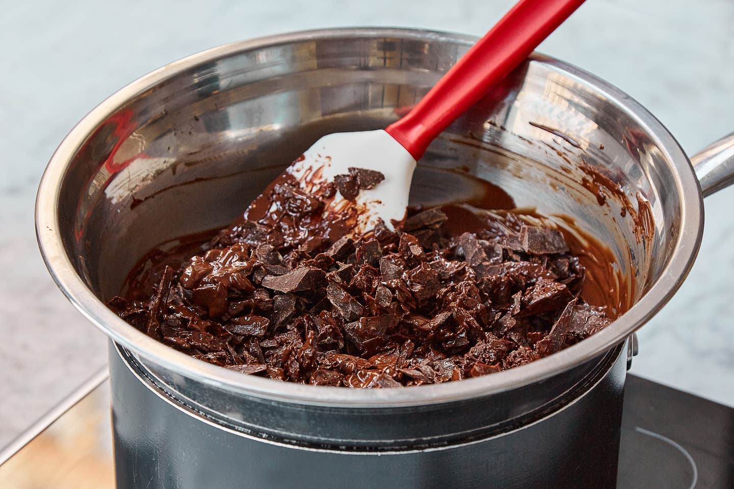 If you don’t have a microwave, you can also do this in a double boiler over low heat. Make sure that the bowl doesn’t touch the water below, advises Muratova, because contact with the boiling water will create uneven heat. Timing will depend on how much chocolate you are melting, but it shouldn’t take more than ten minutes to reach 115 degrees.
