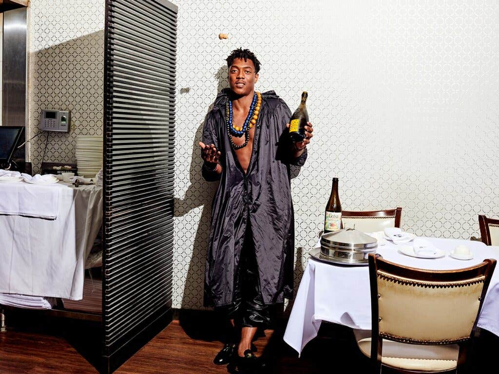 Self-expression is key in this movement, particularly as the wine world in America evolves from the antiquated standard of service in a stiffly-pressed suit. Each Wine Migos gathering is also a celebration of redefining the narrative through fashion. As our shoot for this story began, Uffré and Moncada both emerged from the restaurant’s lower level having changed into fresh looks by menswear designer Willy Chavarria, best known for his nods to Chicanx and Latinx cultures, while Williams wore a shirt of his own design paired with his signature bucket hat (Watson arrived already sporting a Chavarria ensemble). Collectively, the four opt for polished meets playful, with clean, voluminous lines, rich textures, and a bold accessory or two.