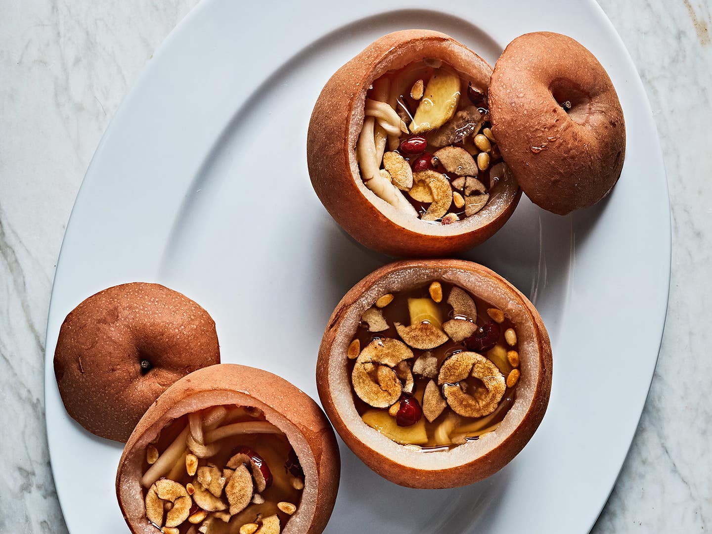 Recipes for baejungtang vary between regions and families, but almost all of them have the same five basic ingredients: pear of course, jujube (red date), ginger, bellflower root, and honey. The pear used in the recipe must be a variety of Asian pear from East Asia as these pears tend to be much bigger - which is important as we also use the pear as an edible bowl - and much crunchier in texture to allow the pear to keep its shape in high temperatures and not turn into mush. The Asian pear is well known for its cooling and hydrating properties whereas the bellflower root, which produces a chemical compound called saponin, is often used for medicinal purposes to boost the immune system.
