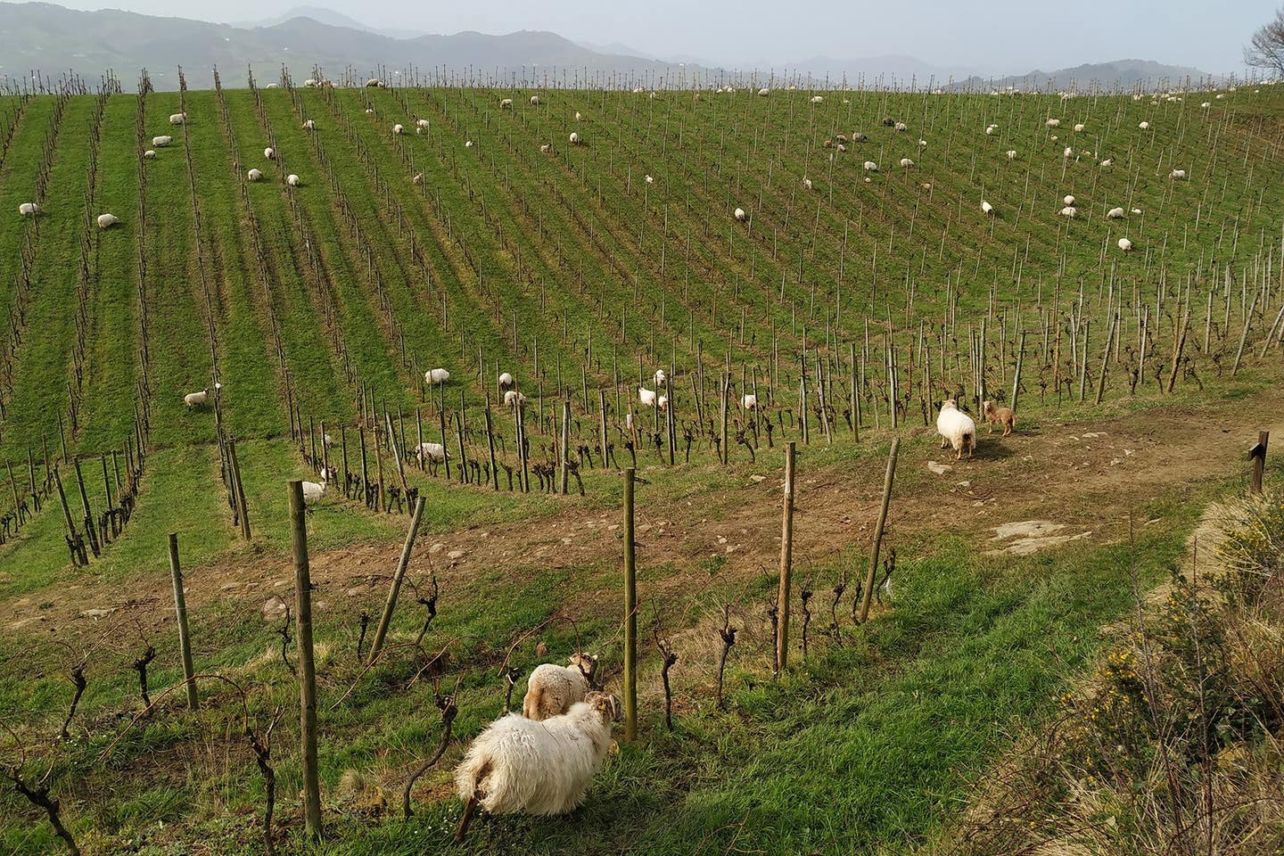 In light of Basque Country’s perpetually rainy climate, it takes some innovative thinking to produce the most authentic wine. Eizagirre tells me that employing sheep to prune the vines was a technique practiced by farmers and winemakers in generations past, but that Talai Berri was the first in Getariako to put sheep to work in their vineyard in modern times. Eizagirre adds that they received valuable advice from winemakers in Bizkaiko (one of the other DOs, southeast of Getariako), who had also been working with sheep: “They told us not to use all of the sheep at once, because otherwise, they eat like crazy—se comen como locos—and could damage the vines. When the sheep are more relaxed, they eat little by little.” It was a steep learning curve for Talai Berri, but their Bizkaiko colleagues helped them get Operation Oveja (sheep) up and running.