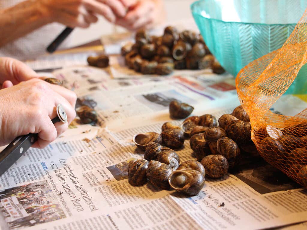 "After a rainstorm, we used to go out and gather them," recalls Stéphanie Pla, Christophe's sister. Their mother, Régine, notes that a certain expertise is required, as well as a period of "fasting" in which the wild snails are purged of any unpleasant viscera, a process similar to purging clams of grit and sand. Snails found in oleander bushes, Régine says, can make a diner quite ill; those found among local genêt flowers, meanwhile, are very bitter, unless made to fast even longer than the recommended 15 days. "We feed them flour and thyme and rosemary," explains Christophe of the fast. After two to three weeks, they're clean and ready to eat.