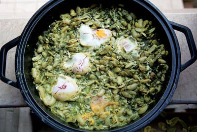 Eggs cooked with dill-scented lima beans is a comforting northern Iranian specialty. See the recipe for Baghali Ghatogh »