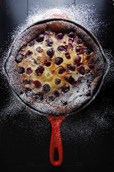 1. Heat oven to 400°. In a 1-qt. saucepan, bring the milk, cream, and vanilla bean with seeds just to a simmer over medium-high heat; remove from heat and set aside. In a large bowl, whisk together sugar, flour, and salt. Whisk in eggs until smooth; add warm milk mixture and whisk until combined. Set batter aside. In a medium bowl, toss the cherries with the kirsch and let soak for 10 minutes. 2. Place an Iron Handle Skillet in the oven to heat for 10 minutes. Remove skillet from oven; add the cherries along with kirsch. Pour batter into skillet; using a wooden spoon, distribute fruit evenly in the batter. Bake until just set in the center and slightly puffed and browned around the edges, 35-40 minutes. Transfer to a rack and let sit for 15 minutes. Serve warm, garnished with confectioners' sugar and a dollop of creme fraiche. SERVES 8 - 10 Photo Credit: Todd Coleman Todd Coleman
