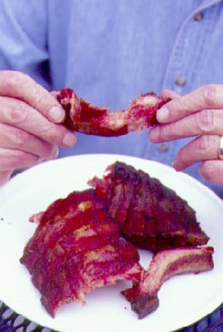 We cook these meaty ribs using indirect heat, meaning not directly over the coals. That way, the meat is infused with pure wood smoke rather than with smoke from fat dripping on the coals.