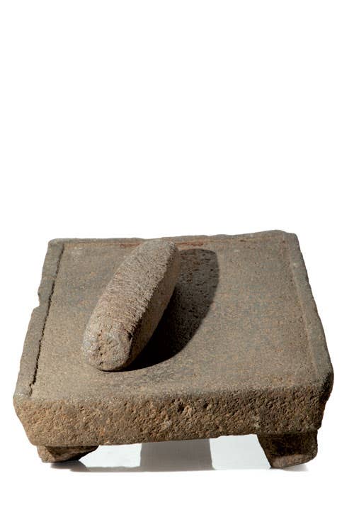 The metate, an ancient tool for pulverizing ingredients, has a wide stone base and a rectangular grinding stone. Many cooks still use it to grind cacao, nuts, and seeds, or to pulverize corn to produce masa harina.