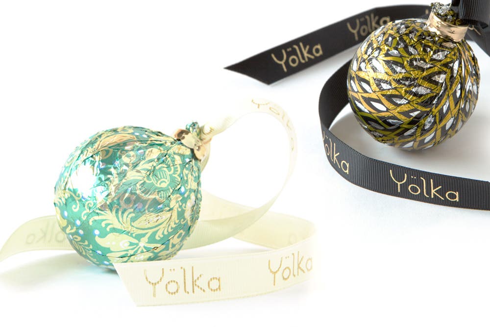 These baroque chocolate ornaments from Yolka, available in milk or dark Belgian chocolate wrapped in white, teal, or black foil, make a pretty addition to the tree–or the table. Yolkachocolates.com