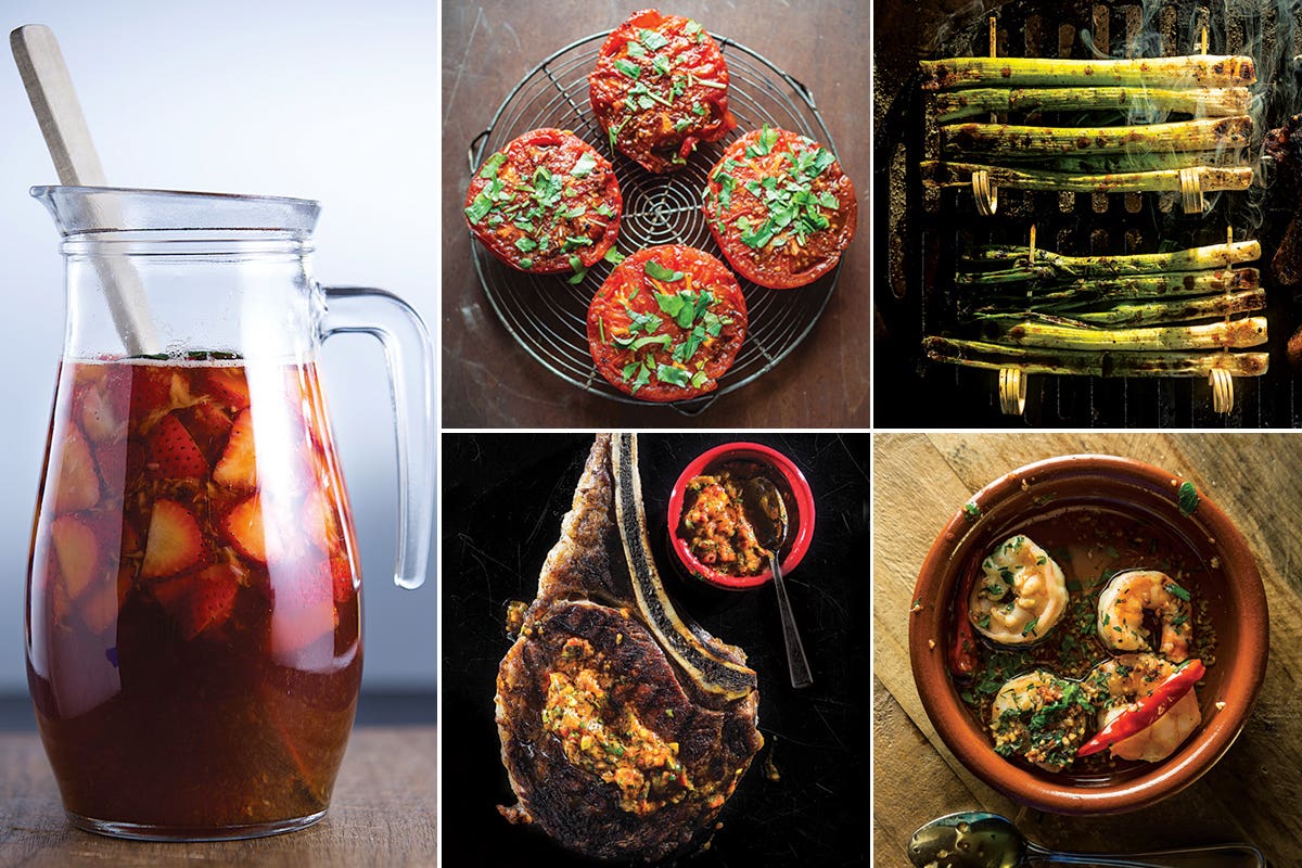 Keep the grill going all evening with a menu of internationally inspired dishes: A juicy grilled rib eye is perfectly matched with charred scallions, sweet grilled tomatoes, and earthy, garlicky mushrooms. Mexican rice pudding pops end the meal on a cold, sweet note, and a pitcher cocktail made with ripe summer strawberries makes an ideal backyard sipper.