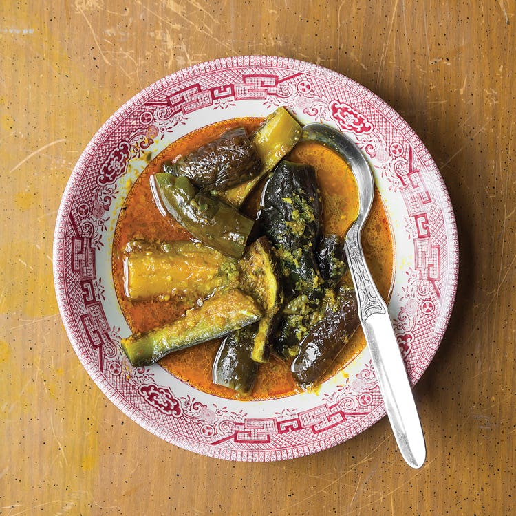 Eggplant is simmered to melting softness in a fantastically pungent curry fortified by shrimp paste. Get the recipe for Burmese Eggplant Curry (Khayan Thee Hnut) »