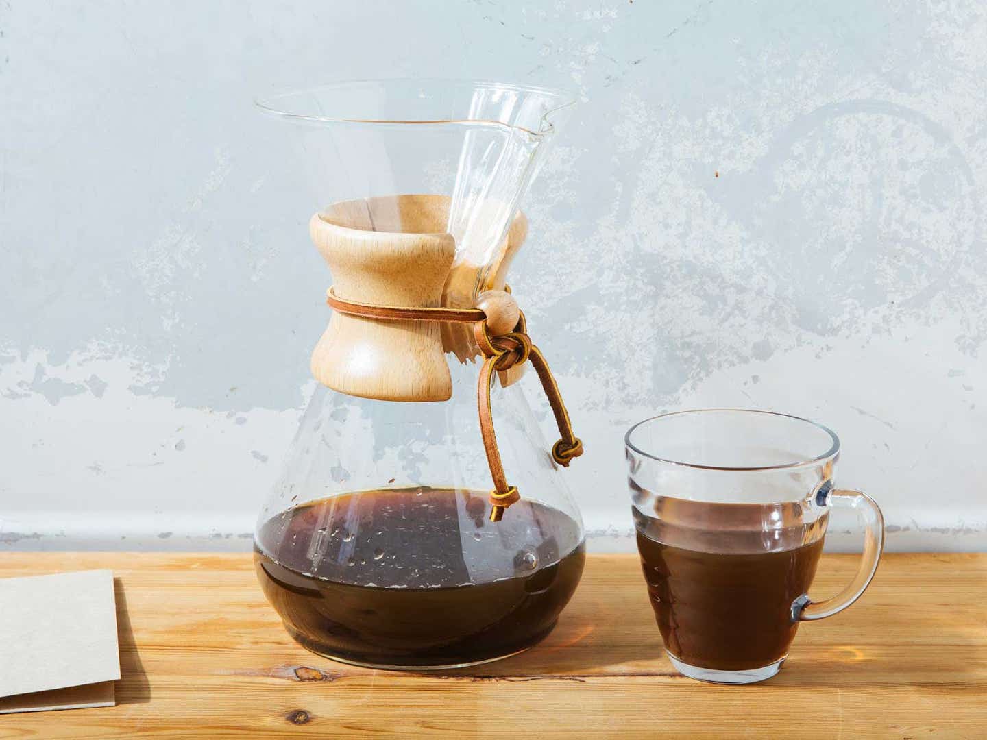 Brewed coffee cools quickly in Chemex’s glass carafe, so the brand suggests wrapping the base in a tea towel or setting it in a warm water bath to insulate. The carafe itself is safe to use over a low flame on the stove; however, Rosenberg advises against reheating coffee in this manner. Doing so accelerates the creation of quinic acid and changes the flavor of the brew.