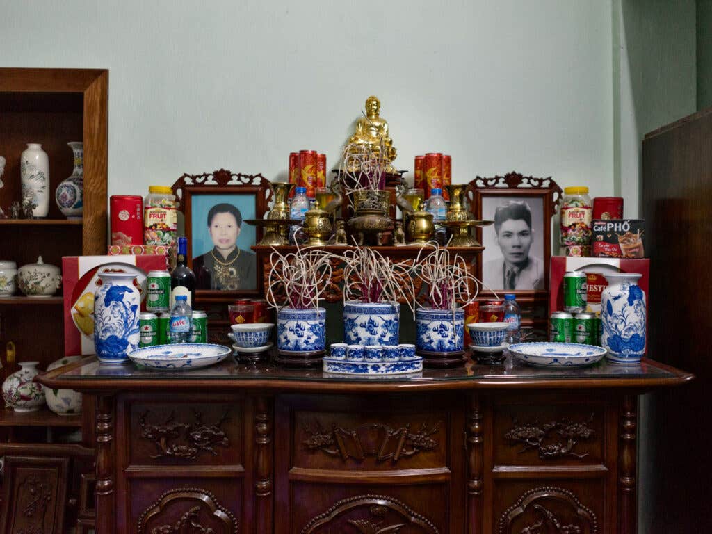 Ms. Minh’s late ancestors, peeking out from picture frames behind burnt sticks of incense and platters of fruit offerings, watch over us while we eat, and a small child is sleeping on a day-bed across the room. We hardly mind as we noisily stuff our faces. The broth is perfectly clear, so much so that I can see every noodle down to the bottom of the bowl, with the flatter, fresh banh pho noodles that tangle around the thinly sliced sheets of lean beef. A sprinkling of freshly chopped scallions and a duo of Thai chilis crown the top.