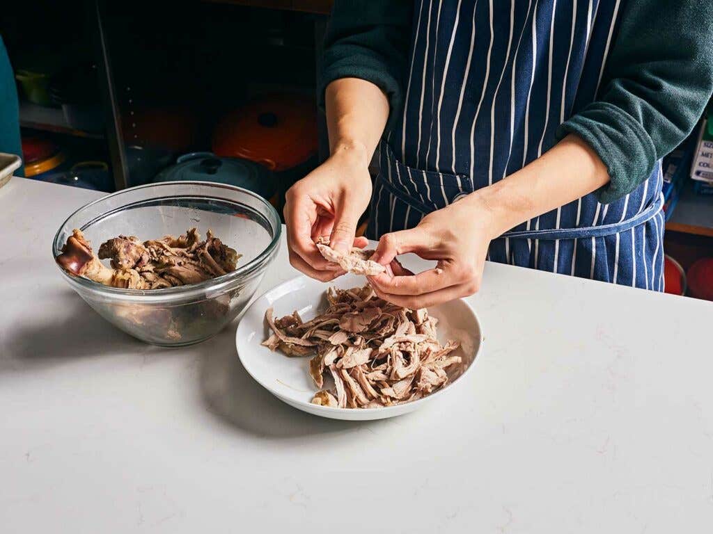 These steps can also be done ahead of time; if preparing the broth and meat in advance, cool the broth quickly in an ice bath, then refrigerate for up to 3 days or freeze for up to 3 months.