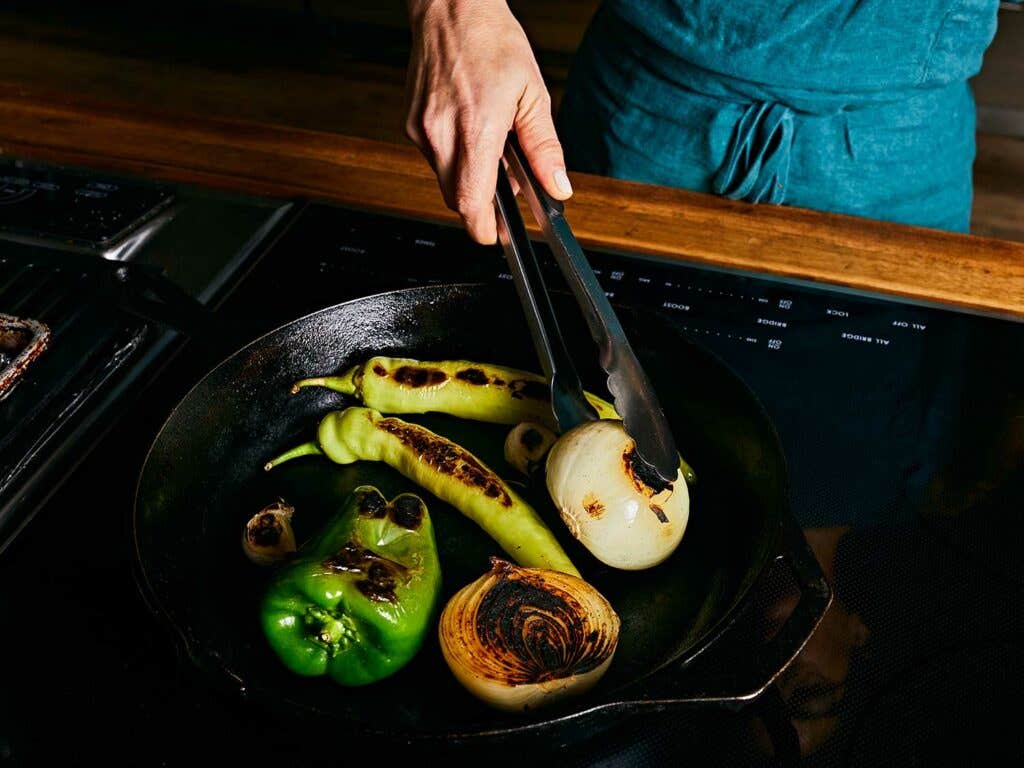 In the Yucatán and throughout Mexico, cooks often char fresh vegetables over a comal (griddle), a small but important step that adds an appealingly smoky, roasted flavor to salsas, soups, and stews. To mimic the effect on the stovetop, heat a dry cast-iron skillet over very high heat, add the peppers, onion, and garlic, and cook, turning occasionally, until charred all over and softened. The pepper skins can be rubbed off with a dry paper towel, or left on for extra campfire notes; discard the stems and seeds. Thinly slice the peppers and onion, and mince or smash the garlic.