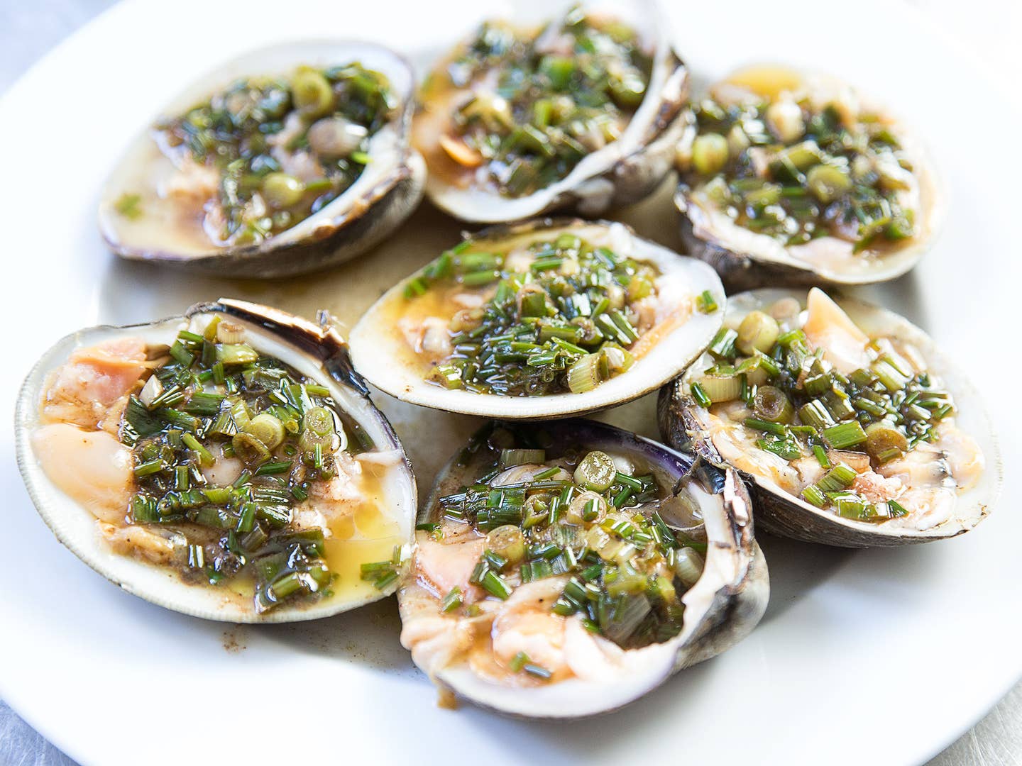 The slight oven warming means you'll want to chill the clams if you plan to serve them raw, or you can go ahead and cook them like Pepin does in the video above. He dresses his clams simply, with either a balsamic–scallion–chive sauce or an herbed up beurre blanc. Either sauce goes perfectly with clams, and you can whip them up in the time it takes to 'pre-shuck' those clams in the oven.