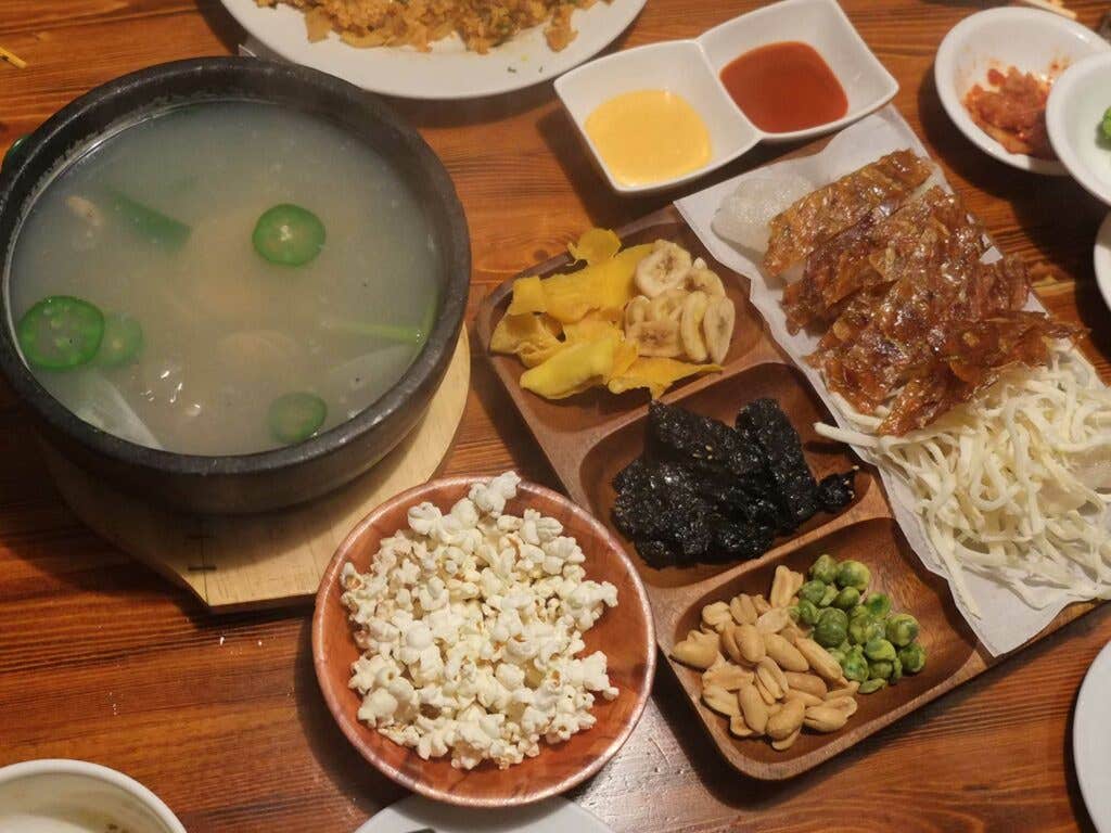 The plate arrives with a pretty minimal banchan set up (small plates of snacks and condiments that accompany every Korean meal) of daikon and cabbage kimchi, seasoned bean sprouts, and stale popcorn and we dive in. On this weeknight, the place is half full, and mostly Korean—less our warmed-up group of four ordering the fish jerky. And while snacking is part of the pocha experience, the food at a Korean bar can run wild, from soups and stews to noodles. This is not snacking food, but Koreatown pub grub.