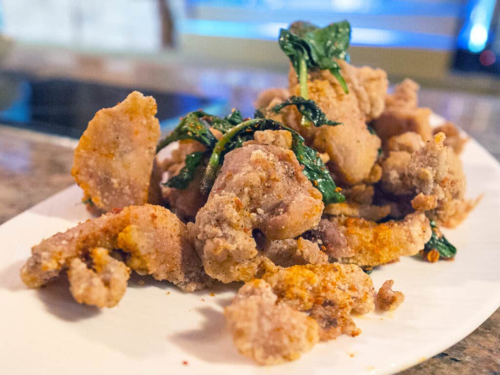 Up next: fried chicken. We have a heretofore-silent pact that mandates we order fried chicken every time fried chicken can be ordered. Every Asian country has its own interpretation of the cult classic many think of as strictly American, from the double-fried sweet and sticky drumsticks that shatter in your mouth in Korea, to the lightly dusted chunks dipped in Kewpie (a cultishly loved mayo that’s like Hellmann’s add MSG and sugar) served in Japan. At Lu Wei, the thigh meat is lightly coated with potato starch and brought to a deep golden brown before being generously seasoned with more Sichuan pepper and MSG, the sometimes-maligned, near essential additive and Asian drinking food staple we’re going to come back to time after time.