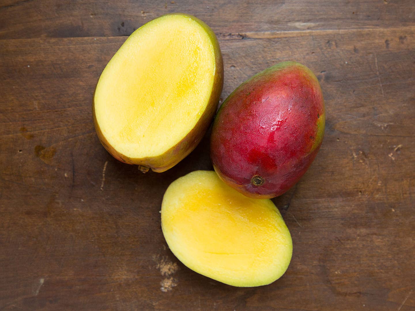 - Fragrance & Sap: This is the most important tell for when a mango is ready to eat—it will get very fragrant and ooze sap without prodding. For the most part, regardless of texture or color, if a mango is filling the room with fragrance and also sapping, it's ready to eat. The major exception here is the Ataulfo, which may not turn super fragrant or sappy even when it is fully ripe (instead, it gets wrinkly—that's a surefire sign it's ready to go).