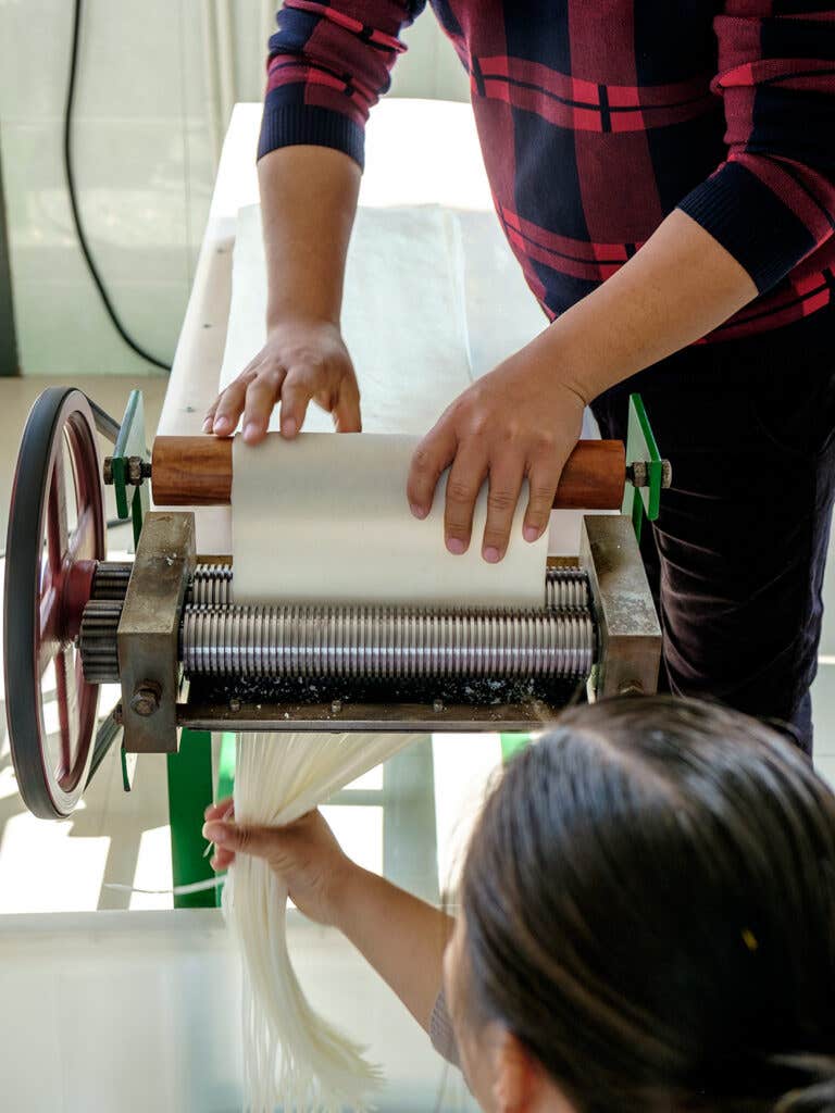 Zao pulled on rubber boots and took me into the workshop. Inside the factory, a few workers were preparing rice, soaking it in a trough then steaming it in large bamboo baskets set over vents that release jets of steam. The heat and moisture are powerful enough to cook more than 650 pounds of rice at one time. Once it was cooked, the workers fed the rice into specially made grinders that turned it into a smooth dough. They kneaded it, still steaming, until it had the texture of soft clay. Lastly, they pressed the mixture into small loaves, and rolled it out into thin circles or fed it into a large machine that flattened it into sheets to make noodle-like ersi.