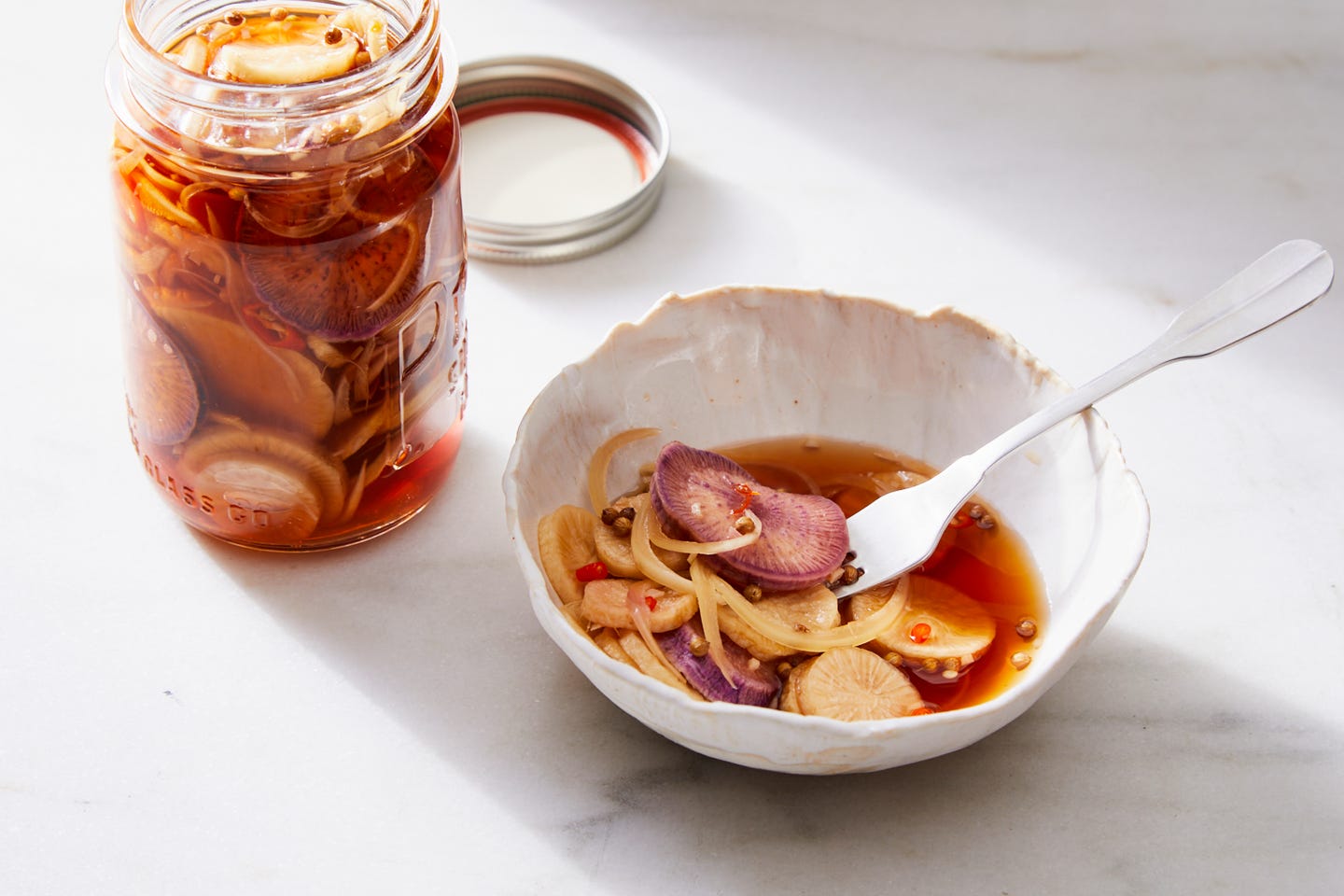 - If using cilantro roots, smash with the flat side of your knife to release their flavor. (If using coriander seeds, use them whole.) Pack the radishes, onion, and cilantro roots (or coriander seeds) into heatproof jars, then pour enough of the warm brine to completely submerge. Cover and set aside at room temperature for 24 hours. Serve immediately or refrigerate and store for up to 1 month.