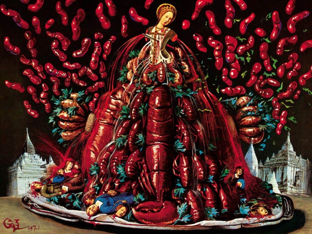 This fall, Taschen published a handsome facsimile edition of Les Diners de Gala, a cookbook the artist wrote in 1973. Named after his wife, also a legendary gourmand, it's one of the most unusual recipe books ever created, a bit like Escoffier on acid. Today, signed copies sell for as much as $25,000. I once sat at the New York Public Library for hours, flipping through Dalí's illustrations of dishes and meals in a kind of terrified thrall. Crayfish towers are topped with the torso of Joan of Arc, her amputated arms gushing blood. Chickens are trussed with barbed wire. A swan, its head chock-full of human teeth, is served on a pastry dish. Dalí is there, too, pictured at the swanky Parisian restaurant Maxim's, wearing a plush velvet suit, holding a golden scepter, surrounded by a Rabelaisian feast of his own devising.