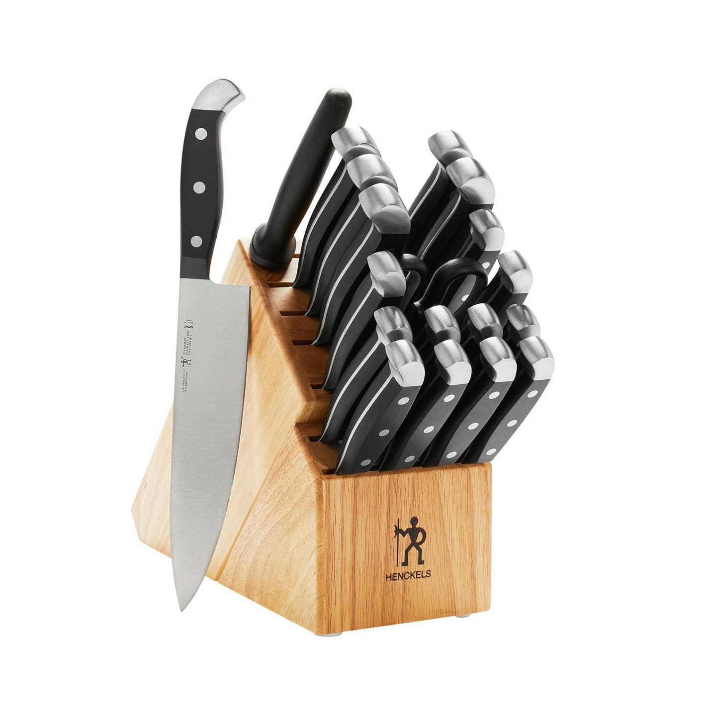 This knife set from nearly 300-year-old German maker Henckels is a great starter kit for cooks of any experience level. It includes 3-inch and 4-inch paring knives, 5-inch and 6-inch utility knives, a 5.5-inch boning knife, 7-inch santoku knife, 8-inch chef’s knife, bread knife, and carving knife, a set of eight steak knives, a honing steel, kitchen shears, and last but not least, a handsome wooden block to store everything. The blades are stain- and rust-free and can be washed in the dishwasher without dulling.