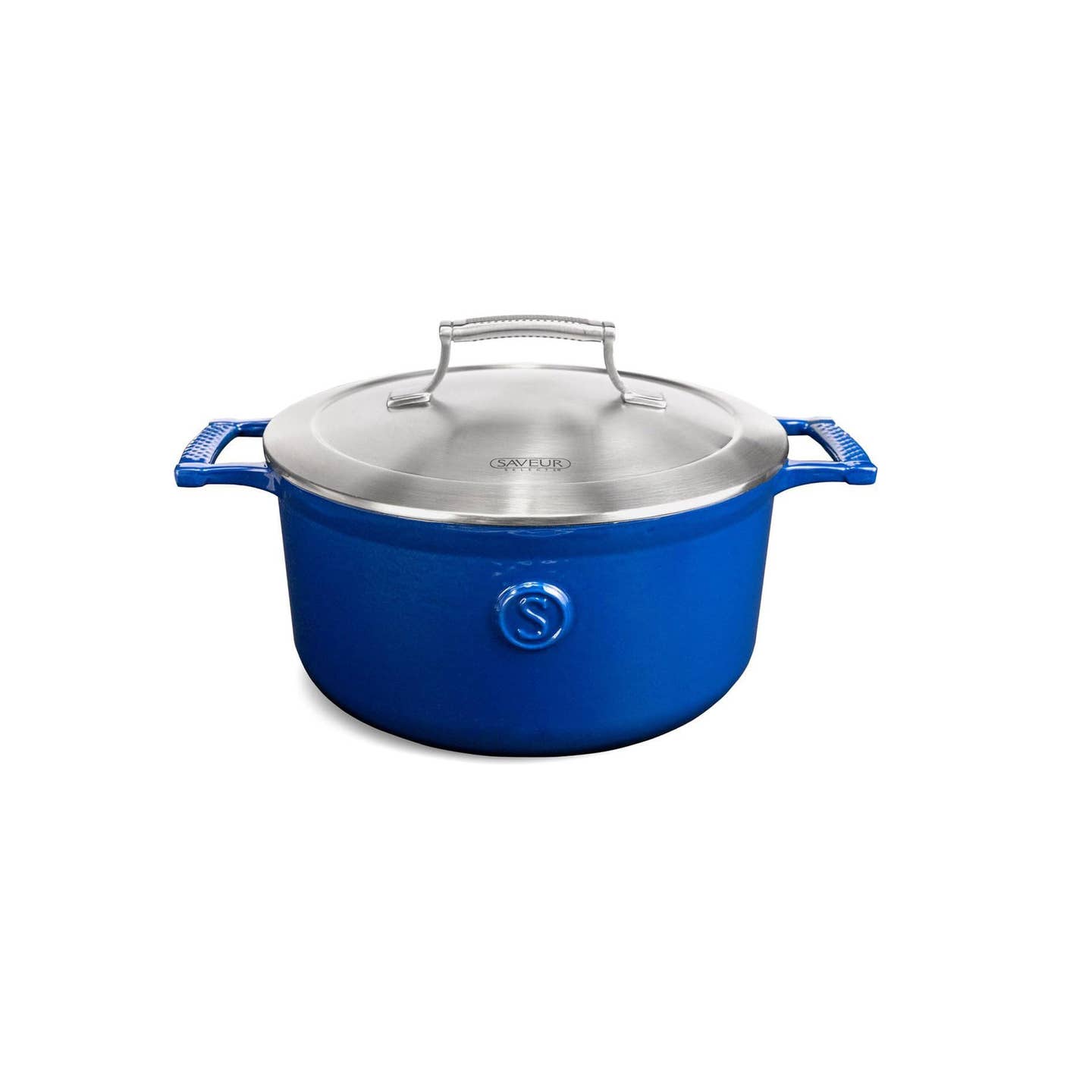 This stunning blue Dutch oven is made to go from stovetop to table. Constructed with enameled cast iron to evenly hold and distribute heat when searing, stewing, braising, and more, it’s a versatile kitchen workhorse and entertaining centerpiece. Its double-walled lid is made of stainless steel and is lighter weight than most comparable cookware, with condensation rings to lock in moisture as you cook on the stovetop or in the oven up to 500°F.