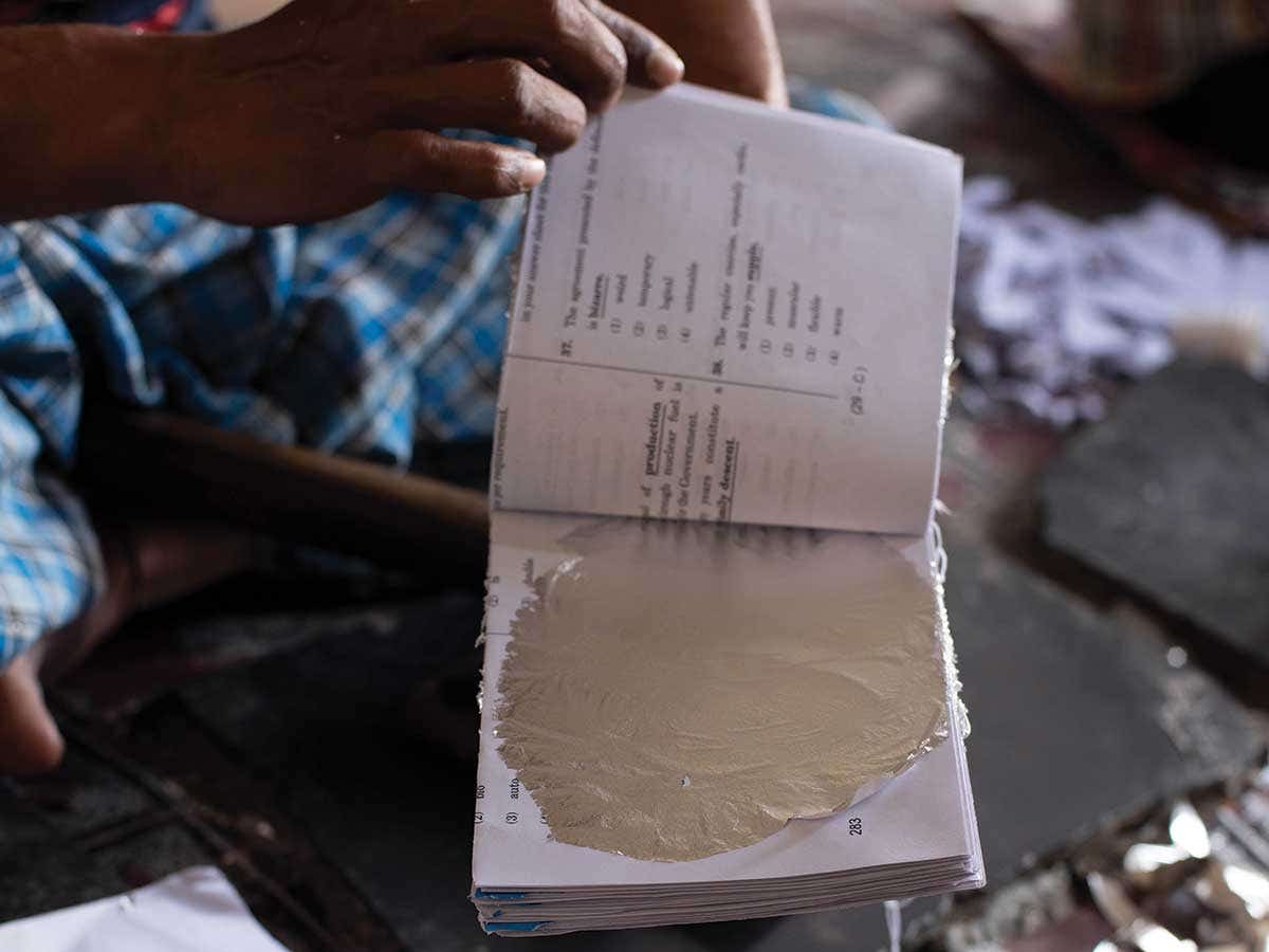 The dwindling popularity of the trade is evident near the Charminar, where warq workshops once numbered in the dozens and now just a handful remain. “They all closed up,” a shopkeeper laments. “There’s no business left.” The introduction of machines that dramatically reduce both the time and cost of producing warq are somewhat to blame, as they’re edging out the artisanal competition from the karigars. But the machines aren’t transforming the business; they’re merely eating into what’s left of it: As impure imposters laced with aluminum or nickel enter the market, people are becoming wary of the quality of the warq they’re consuming. “Those with the machines are giving us a bad name,” one shopkeeper tells me in Urdu. “If they give us a bad name, their business increases.” What’s more, a void of wealthy patronage has caused a dwindling interest in carrying on the centuries-old tradition. Religious undercurrents might play a role too, with the current political climate fomenting tensions between Hindus and Muslims, the latter of whom dominate the handmade trade.