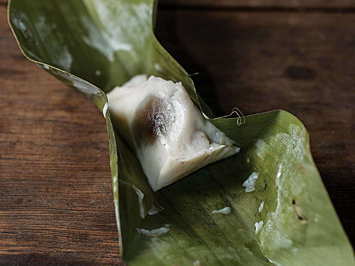 - Preheat a large bamboo steamer over medium heat. One at a time, prepare each ball to be steamed: Drop a ball into the coconut cream mixture, use a spoon to remove it with an additional tablespoon or so of the coconut cream, then transfer to the center of the matte side of one banana leaf. Bring one of the leaf tips over the coconut mixture, folding the cut sides to enclose the exterior of the package. Repeat with other tip to overlap the points. Thread a toothpick into the leaves to seal the package.