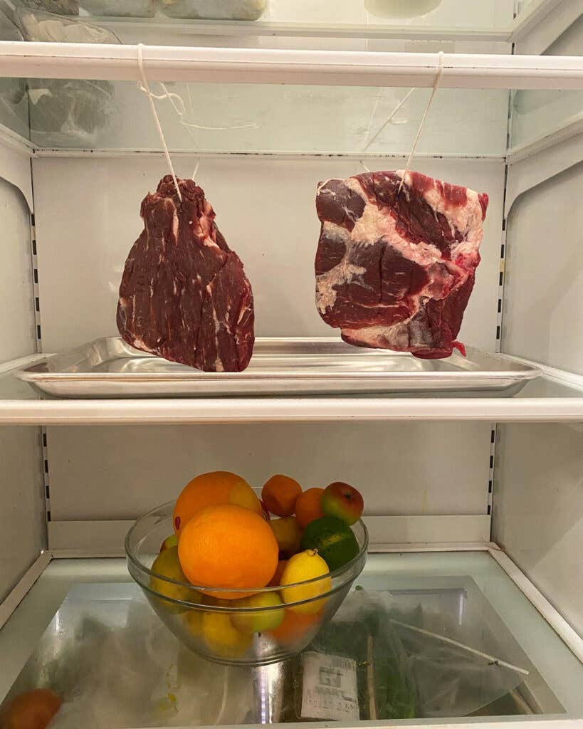 - Find a place to hang the meat as it cures, preferably in a clean room that never exceeds 70°F, with some airflow. Next, uncover the meat and remove and discard the paper towels. The beef should be flat and slightly firm to the touch. With a skewer, pierce each piece about 1 inch from one end. Tie a piece of butcher’s twine in a knot on one end of the skewer and, leaving the other end of the twine long enough to hang the meat from the desired spot, thread it through the hole in the first piece of beef. Repeat with a second length of twine and the other piece of beef. Hang the meat up by the string and allow it to air-dry for 5–10 days, or until the pieces of beef feel as firm as a nearly-ripe avocado. (Alternatively, hang the meat in the refrigerator for 8 to 14 days. You may place a rimmed baking sheet underneath, though the meat should be dry from the cure and no longer dripping.)
