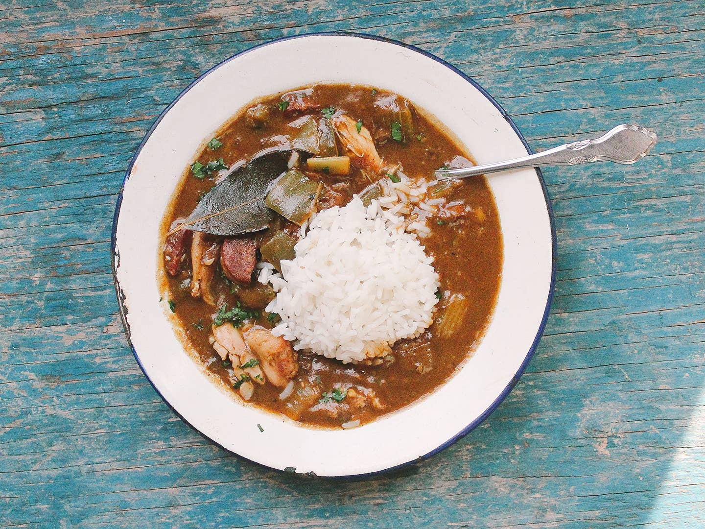 Over the din, we kept hearing some version of “this is the best breakfast I’ve had.” As the beads and coconuts started flying off of the floats, it was finally time for us to enjoy the fruits of our labor. We ate quietly, taking it all in: the richness in our bowls, the cacophony around us. Like other New Orleanians, I’ll be missing Zulu (and partying with my friends) this year—but luckily our celebratory dish scales down to a home-sized batch just as well. Mardi Gras comes but once a year, and with it, breakfast gumbo.