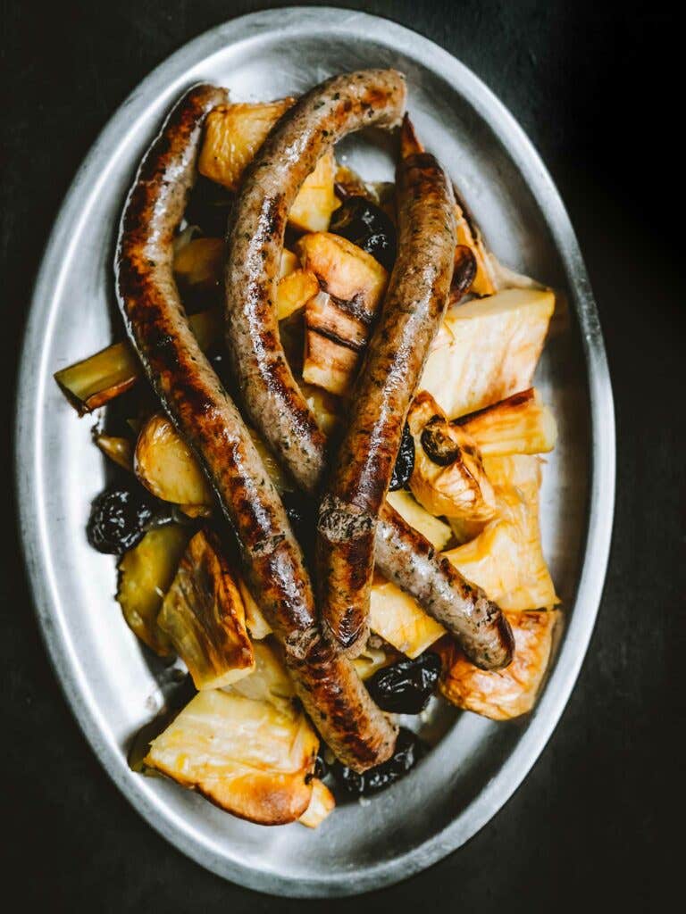 Just as they are meant to be simple, Marie-Aude and Daniel’s holiday recipes are written to be versatile. You can sub chicken, venison, or wild rabbit for the wild boar in the sausages, swap the chervil for dill or parsley in the cranberry-grapefruit salad, or substitute pear puree for the pumpkin in the charlotte, all to excellent result.
