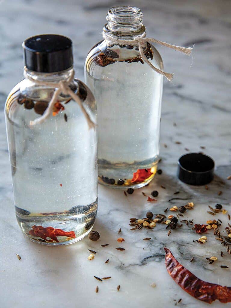 In a small, dry skillet over medium heat, toast 1/4 teaspoon allspice, 1/4 teaspoon black peppercorns, and 1/4 teaspoon cumin, stirring frequently, until very fragrant, about 3 minutes. Divide 2 cups tequila blanco among four 4-ounce glass bottles. Add to each equal parts of toasted spice mixture, as well as 1-2 fresh or dried red Thai chilies (smash with side of knife first).