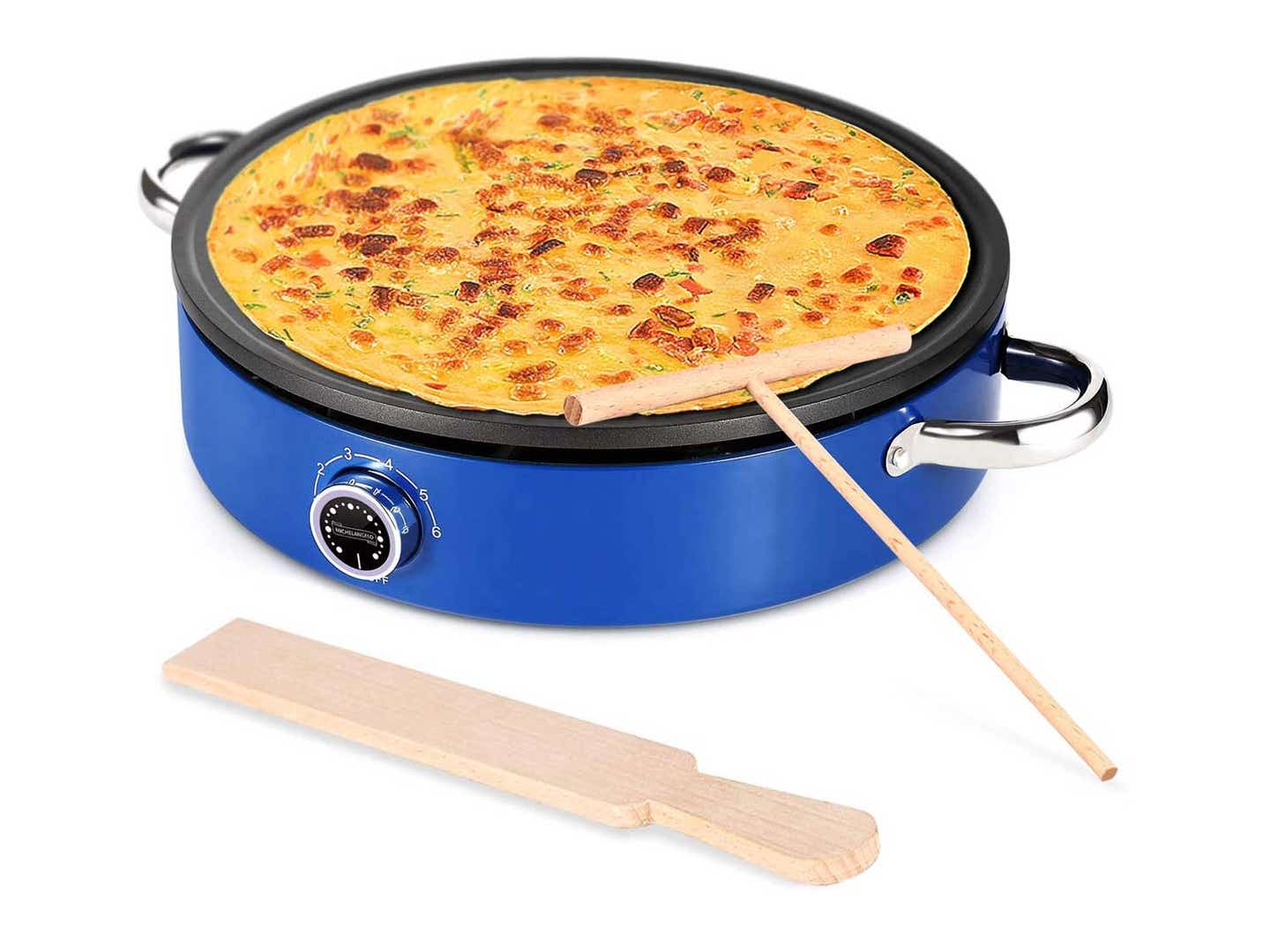 If you’re looking for something straightforward, this model is your winner. Complete with a “light” to “dark” thermostat control, the ISiLER also boasts an overheating protection feature, ensuring that your crepes will never burn. Reviewers have reported that it works great for other foods, too, including pancakes, tortillas, eggs, and even dumplings.
