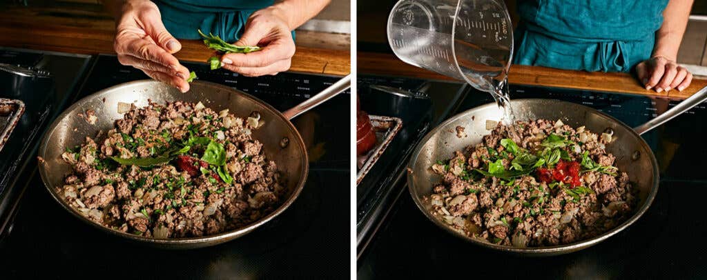 In the grand scheme of things, the 30-minute slow simmer of meat, tomatoes, and spices is a small price to pay for ultimate satisfaction. Simmer the sauce until it’s deeply flavorful, adding water only if needed to keep things saucy. When you’re happy with the depth, toss the pasta and meat mixture together and set aside in a warmish (but not hot) place.