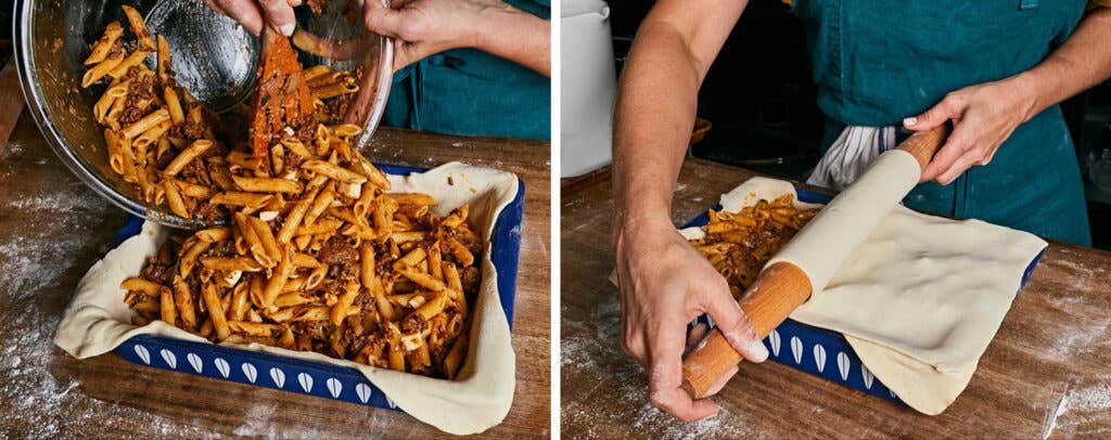 Spoon the pasta and filling into the prepared pastry-lined pan, tamping down lightly to create compact layers. (Note: If you want to give your pie the full Big Night treatment, this is the place to layer in hard-boiled eggs or meatballs.) Finally, cover the pasta with another layer of puff pastry, crimping the excess over itself, and pinching every few inches to make a tight seal.