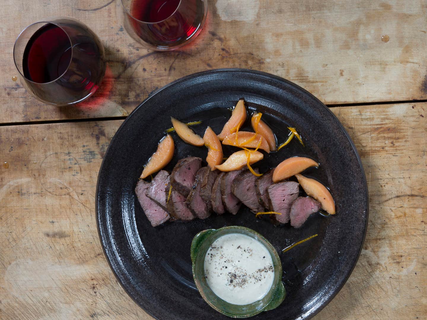 Similar to applesauce served with pork, this recipe, adapted from chef Stuart Bell of Ten Minutes by Tractor restaurant in Mornington Peninsula, Australia, uses sweet, spiced quince to balance faintly gamy venison loin served atop a creamy shallot sauce.