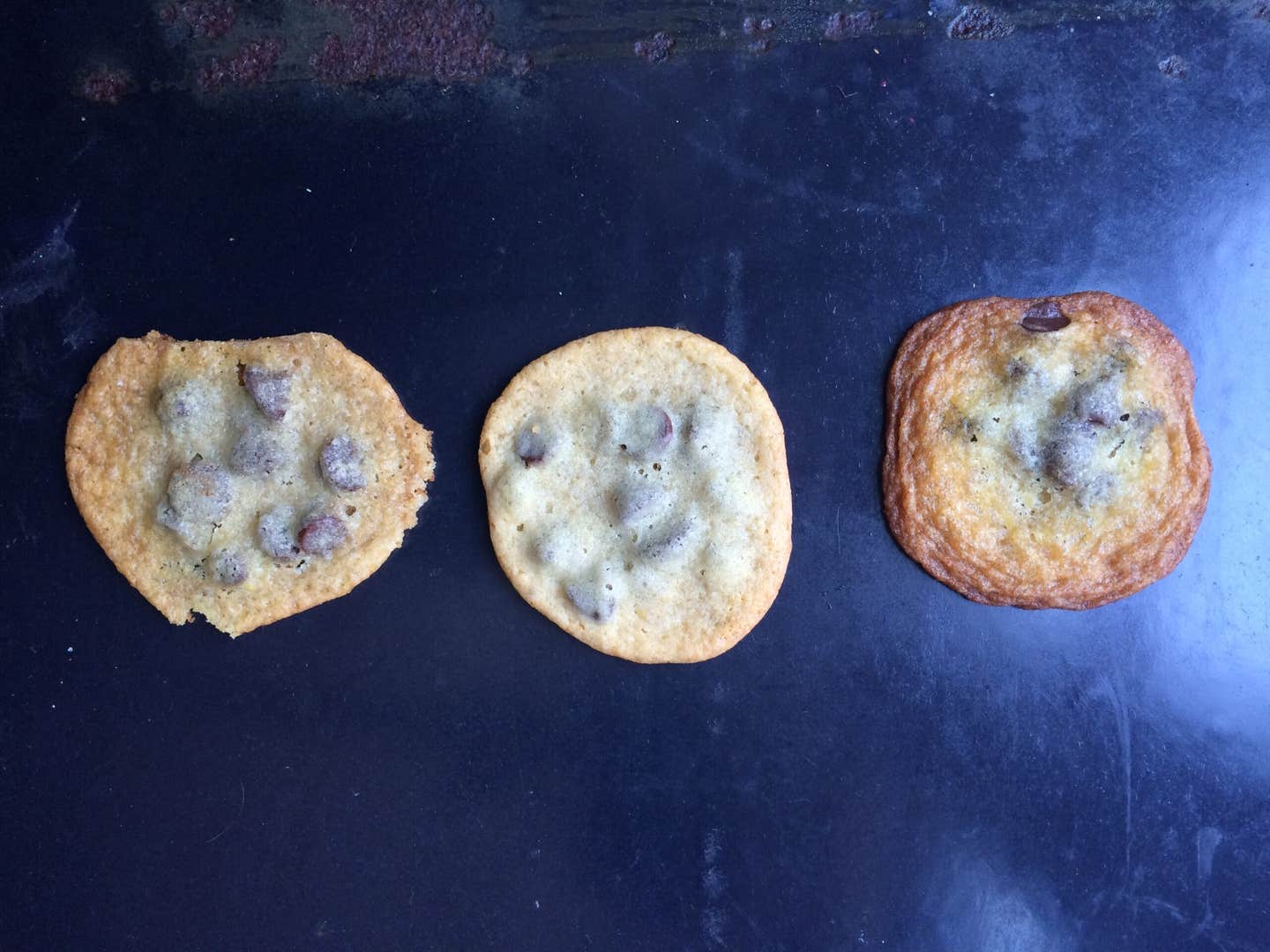 We were having some issues making cookies this week. A recipe called for scooping tablespoons of dough on a sheet tray and baking at 350° F for 15 minutes. However, the resulting cookies spread into each other. After an initial round of ugly cookies, we then tried rolling them before baking. This second batch was perfect in shape, but thin and extremely pale in color. Finally, we realized the issue was that the dough was too wet due to a hot kitchen, a common problem in the summer. The final batch was rolled and chilled for 20 minutes before baking. By chilling your dough, you allow the butter in it to firm up, so when it enters a hot oven it takes longer to expand. Et voila: perfectly golden cookies that did not spread too much.