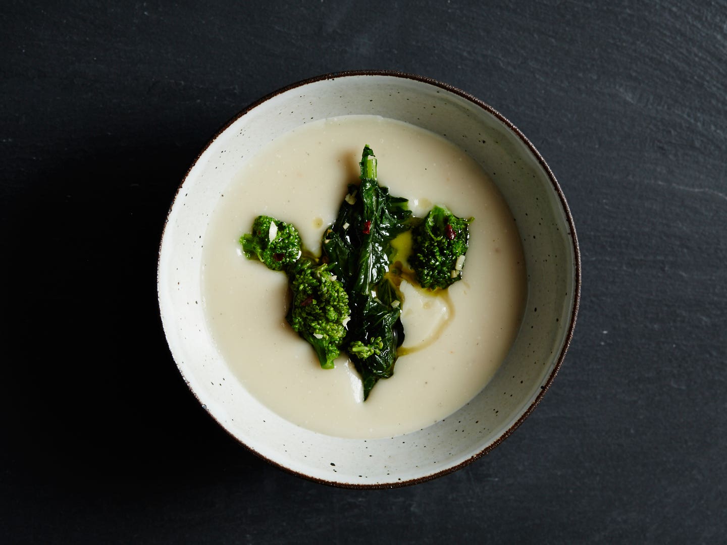 - In a medium skillet, heat the remaining 2 tablespoons olive oil over medium-high. Add the chile flakes and garlic and cook for 2 minutes. Stir in the broccoli rabe, season with salt and pepper, and cook until warmed through, about 2 minutes. Divide the soup among bowls and top each with some of the broccoli rabe and a drizzle of more olive oil before serving.