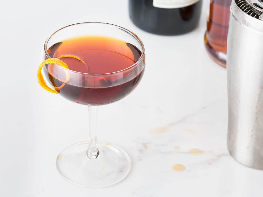 Based on the Blood and Sand, created in honor of actor Rudolph Valentino’s famous 1922 bullfighter film, this Irish version from Dublin’s Sidecar Bar substitutes fruit-forward spirits for the original vermouth and blood orange juice. Amarena cherries give it a sweet finish. Get the recipe >